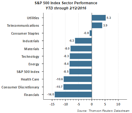 One factor contributing to the underperformance of the low quality index is the large 29% weighting in financials versus 5% in the high quality index. As the last chart below shows, financials have taken it on the chin so far this year.
