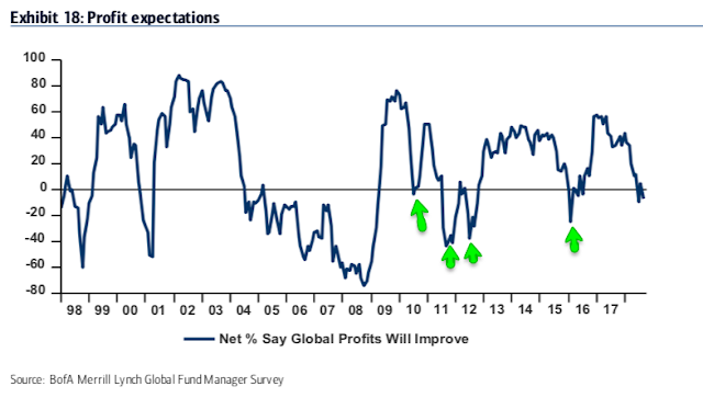 On a net basis, fund managers expect profits to deteriorate in the next 12 months, among their most bearish views since February 2016. Negative profit expectations also marked equity lows in mid-2010, late-2011 and mid-2012 (arrows).