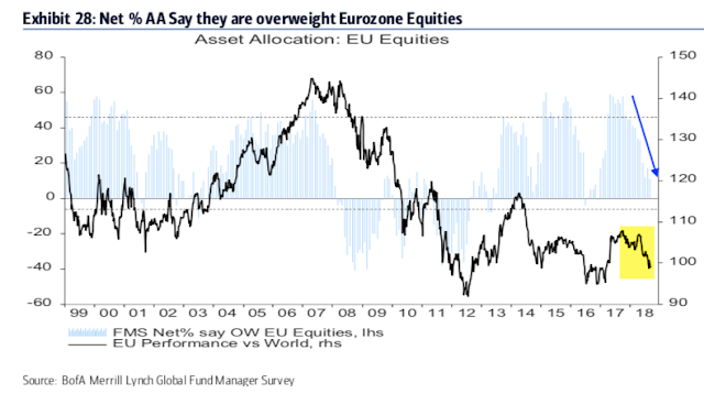 Fund managers had been excessively overweight European equities in 2015-16, during which time European equities underperformed.
