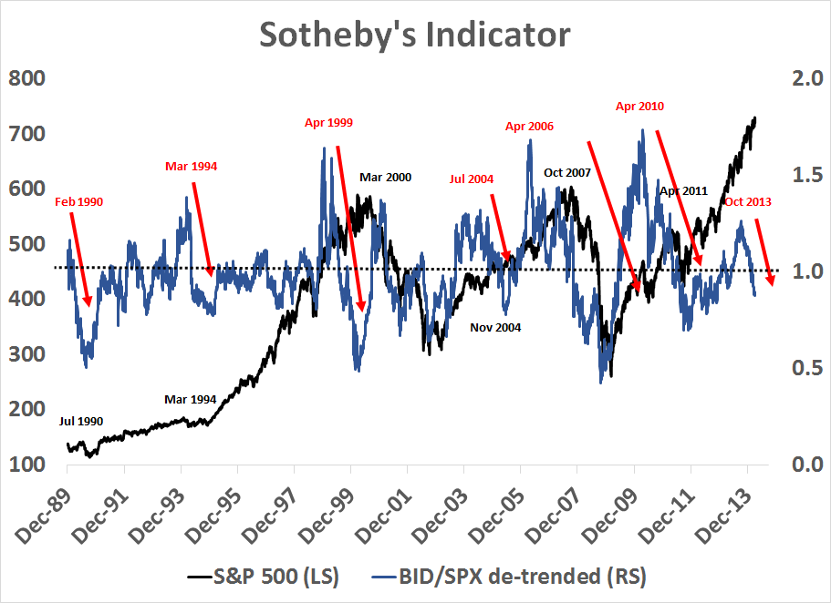 My modified Sotheby's Indicator peaked out in October 2013, though the highs it reached was not as high as levels seen in previous significant market peaks. However, the chart shows that this indicator is not very useful as a tactical timing model as the lags between the peaks in the Sotheby's Indicator are uncertain. Nevertheless, it does provide a warning of the investment environment.