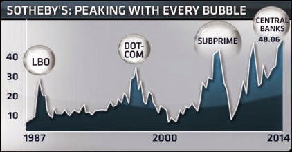 The chart shows that shares of Sotheby's have peaked before every major financial bubble since 1987, starting with the leveraged-buyout spree that fueled the stock market before the Black Monday crash that year.