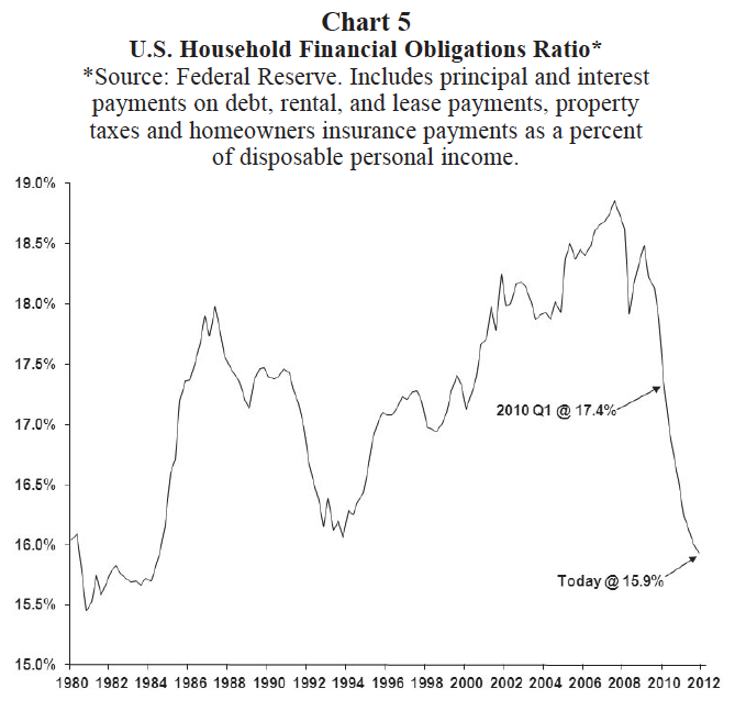 Finally, and most importantly, the U.S. consumer is no longer languishing under an oppressive debt burden. Chart 5 shows the U.S. household financial obligations ratio reported by the Federal Reserve. This ratio includes all debt service payments, lease and rental payments, property taxes, and homeowners’ insurance payments as a percent of disposable personal income. It reached an alltime record high in 2007 of about 19 percent illustrating the weak and vulnerable position of the U.S. household sector just prior to the last recession. Indeed, this burden was still 17.4 percent when the first spring swoon hit the recovery in early 2010. Today, however, this ratio has fallen below 16 percent, and rather than being at an all-time record high, it is now close to a record low!