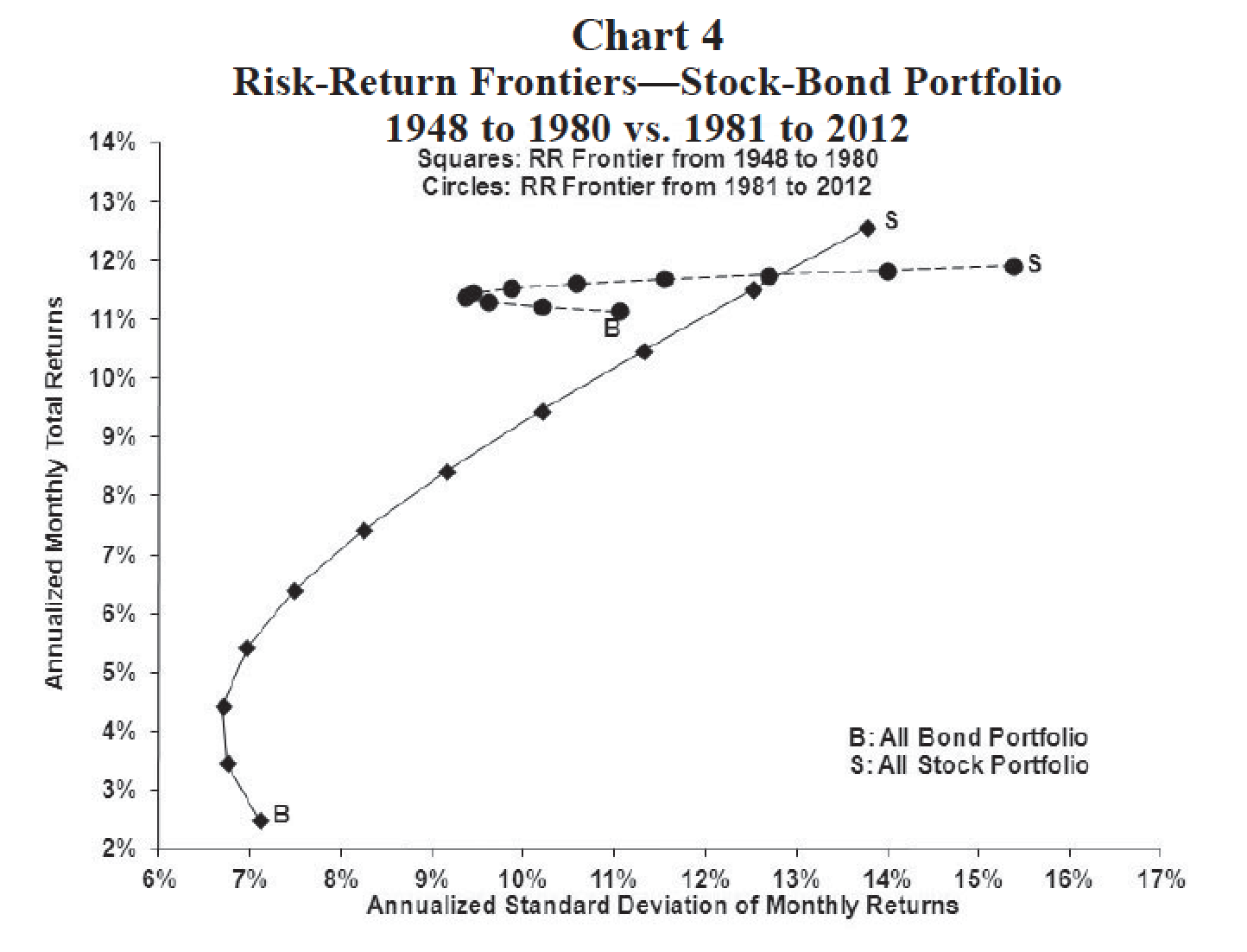 The risk-return frontier changed significantly since 1981 when bond yields began a chronic decline. In the last 30 years, stock and bond returns have been nearly identical “regardless” of the allocation between stocks and bonds. An all bond portfolio generated about 11.1 annualized percent returns compared to only 11.9 percent annualized returns from an all stock portfolio. Since 1981 (and in sharp contrast to the previous investment era before 1981), boosting stock exposure in the portfolio mostly increased risk and only marginally improved returns.