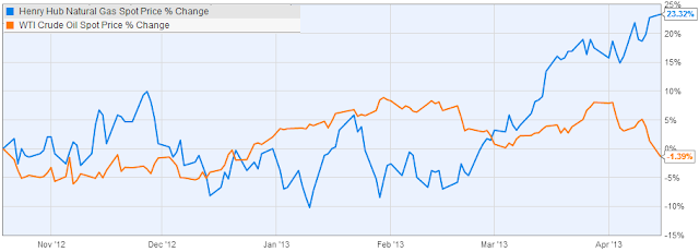 The recent outperformance of US natural gas over crude oil has been quite spectacular - some 25% just since the beginning of March-2013.