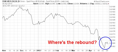 Last week, I suggested that traders should watch the silver/gold ratio for signs of a sustainable rally (see Watch silver for the bottom in gold). The idea was that silver, being the more volatile poor man's gold, should display positive relative strength against gold and lead a precious metal rally if these metals are in the process of making a sustainable bottom. Look at what's happened to the silver/gold ratio since then: