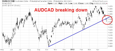 In my previous post, I also wrote about watching the AUDCAD currency cross rate, with the premise that the Australian Dollar is more sensitive to growth in China and the Canadian Dollar is more sensitive to growth in the American economy. A breach of the uptrend in this cross rate would would be a signal that the market's belief that Chinese growth is slowing, which would be negative for the global growth outlook. The breakdown in this currency pair cannot be regarded as good news for the prospects of Chinese growth.