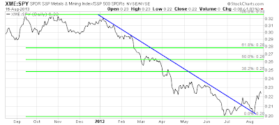 Here is the longer term XME relative chart. XME remains in a downtrend relative to the market and the site of the relative downtrend line approximately coincides with the 38.2% Fibonacci retracement level from the previous shorter term chart.