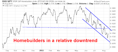 First of all, there is little question that the leadership of homebuilding stocks are rolling over. The chart below shows the market relative returns of the homebuilding ETF (XHB), which is in a relative downtrend after breaking key relative technical support levels.