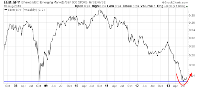 Similarly, we have seen a relative rally from emerging market stocks (EEM) against US equities (SPY) as it bounced off a long-term relative support level.
