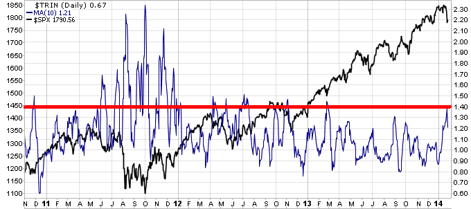 Although for most of last year, the 10-day TRIN reaching the 1.20-1.30 range was often enough to establish a bottom.