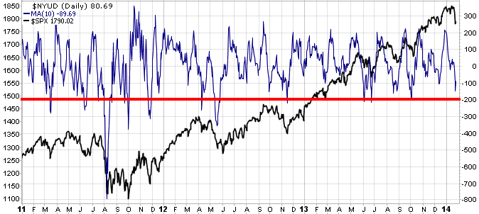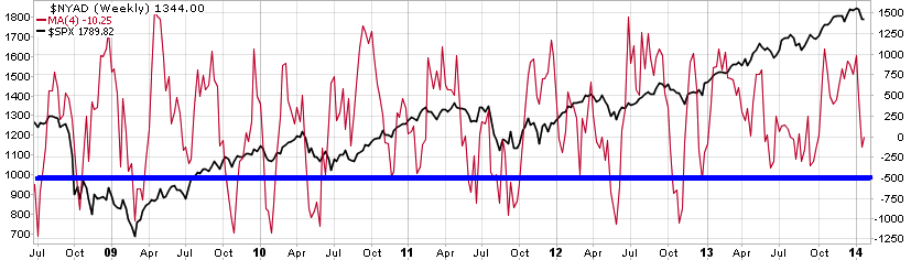 And the 4-week NYSE advance-decline line got below zero, but has not reached the -500 level, much less -250: