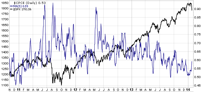 The 5-day equity put-call ratio has spiked higher but remains very low, inferring still too much optimism exists: