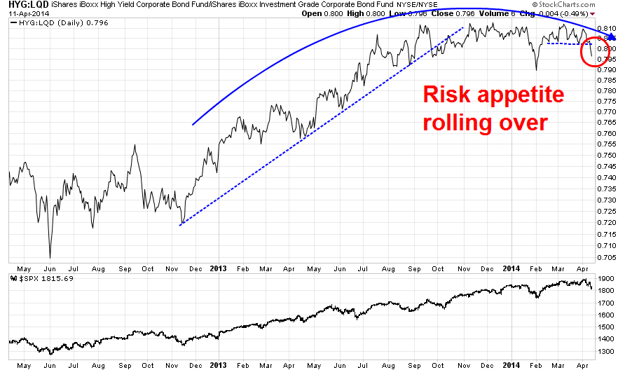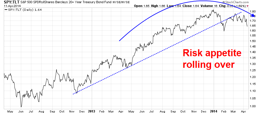 Market psychology is definitely shifting. In my last post, I had constructed an equity-based risk appetite index and showed that it was rolling over (see Bears 2 Bulls 1):