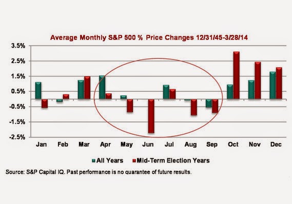In summary, it appears that the intermediate term trend for stock prices is down. It would not be unusual at all to see a mid-term election year correction of 10-20% on a peak-to-trough basis. After which, equities typically present a great buying opportunity into 2015.