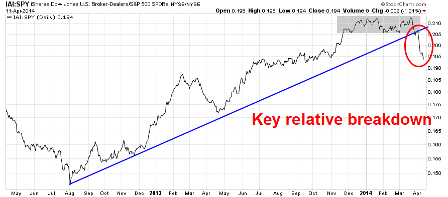 Groups that should lead the market up if this was a bull phase, such as the broker-dealers, are also turning down. The relative performance chart of the broker-dealer ETF (IAI) to SPY below shows both the breach of a relative uptrend and a breakdown from a relative consolidation range (shown in grey):