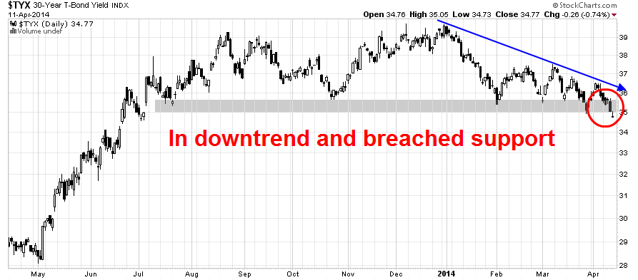 What's more, downtrending long Treasury bond yields have decisively broken technical support, which is bond price bullish and stock price bearish.