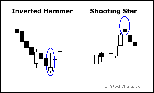 The Inverted Hammer is comprised of one candle. It is easily identified by the small body with a shadow at least two times greater than the body. Found at the bottom of a downtrend, this shows evidence that the bulls are stepping in, but the selling is still going on. The color of the small body is not important but the white body has more bullish indications than a black body. A positive day is required the following day to confirm this signal.