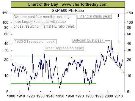 In a recent post, I showed that the trailing P/E ratio for the SP 500 was elevated relative to its own history, even adjusted for the current low level of interest rates (see A secular steer?).