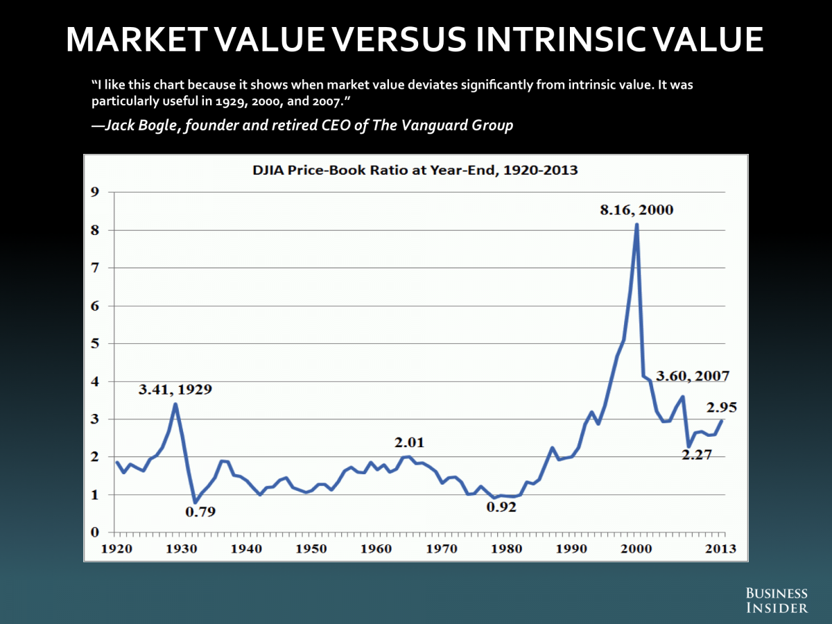 Jack Bogle of the Vanguard Group provided further evidence that equity valuations are high relative to their own history based on the P/B ratio. Like the chart above, the P/B chart goes back to the early 1900s.