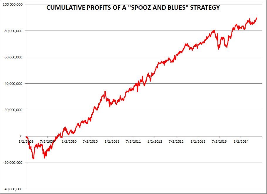 But hey- picking the right risk parity strategy might require some thinking as well. Even better is an equally weighted "Spooz and Blues" portfolio, as popularized by Jefferies' David Zervos. An equally vol-weighted portfolio of E-mini S&P futures and the 14th eurodollar contract has generated cumulative profits of $90 million per 1000 Spooz, including carry, since the beginning of 2009. Moreover, the returns have been pretty consistent, with the "trade once a quarter" strategy delivering an information ratio (i.e., annualized return to risk) of 1.20 over that time period.