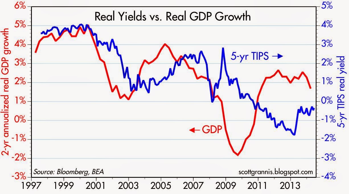 Real yields on short- and intermediate-maturity TIPS can also serve as proxies for the market's desire for safe assets. TIPS are unique in that they are default-free, inflation-protected, and they are the only security in the world with a government-guaranteed real yield that you know in advance. Gold is a classic "safe asset," being historically a refuge from inflation and geopolitical risk. As the above chart shows, the price of TIPS (shown here using the inverse of their real yield as a proxy for their price) has tracked the price of gold in recent years quite closely since 2007. Both have acted as safe havens for all the concerns that arose in the wake of the 2008 financial and economic collapse that affected nearly everyone around the globe. One of the more important developments of the past year or so is the decline in both TIPS and gold prices. That tells us that the world's demand for safe assets has declined meaningfully, even though it remains elevated. I've been watching these two assets very closely for over a year, looking for signs of a further decline in the demand for safe assets. Should it occur, I think that would go hand in hand with a return of optimism, a decline in the demand for money, and, eventually, an acceleration in nominal GDP and inflation. And that, in turn, would show up as higher interest rates and probably a somewhat stronger economy.