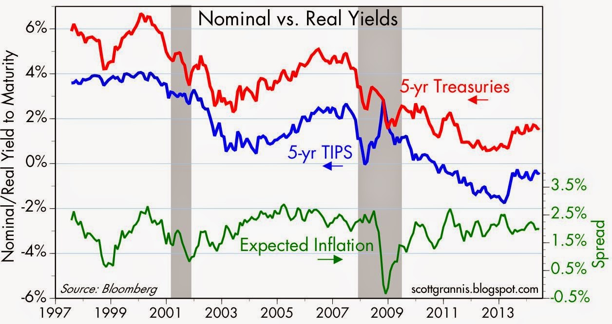 The chart above compares the nominal yield on 5-yr Treasuries to the real yield on 5-yr TIPS. If you subtract the real yield on TIPS from the nominal yield on Treasuries you get the market's expected inflation rate over the next 5 years (more commonly referred in the bond market as the "break-even" inflation rate, since that is the inflation rate that would cause holders of TIPS and Treasuries of similar maturities to have similar total returns). The main message of this chart is that inflation expectations haven't changed much over the past 17 years: the average expected inflation rate since 1997 is 1.94%, and the current expected inflation rate, by this measure, is 1.98%. The actual annualized CPI inflation rate over the past 17 years was 2.3%. So TIPS have underestimated inflation by a little. But in any event, this chart tells us that the market is not very concerned about rising or falling inflation, and that, in turn, suggests that the Fed is doing a good job.