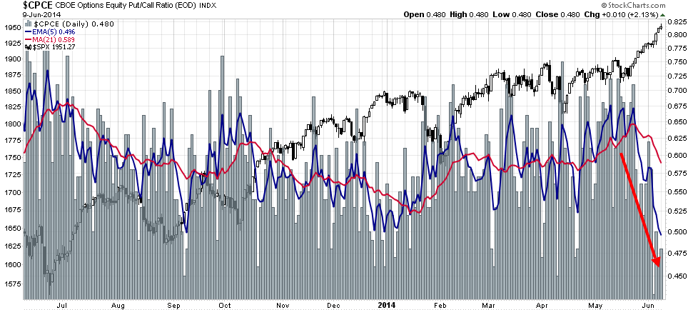 Option sentiment indicators are also signaling excessive bullishness. The equity only put-call ratio is at extremely low levels, as is the 5 day EMA (blue line).