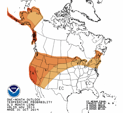 THE TEMPERATURE OUTLOOK FOR NOVEMBER-DECEMBER-JANUARY (NDJ) 2014-15 INDICATES ELEVATED PROBABILITIES OF ABOVE-NORMAL MEAN TEMPERATURES FOR ALASKA, THE FAR WEST, ALONG THE NORTHERN TIER OF THE CONTINENTAL U.S. EASTWARD TO INCLUDE PARTS OF THE NORTHEAST AND MID-ATLANTIC. BELOW-NORMAL MEAN TEMPERATURES ARE MOST LIKELY OVER AREAS FROM EASTERN NEW MEXICO TO THE WESTERN GULF COAST STATES.