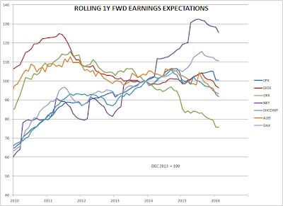 Given where we are in the developed market equity cycle, however, it difficult to get enthused about buying for anything other than a punt...and even there, we've just had a nice rally already, so how much upside is left. Macro Man noted a week or two ago that he was agnostic about the next 3-5% in US equities; a big reason is that one of his favourite indicators, rolling 12m forward earnings expectations, is showing no signs of life on a structural basis. Indeed, in many markets, it's moving the wrong way altogether.