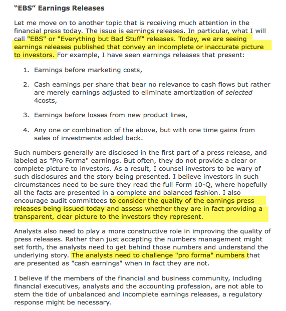While non-GAAP earnings have become a hot button in the past month, the statement above was made 16 years ago (link). It was an issue even earlier, with non-GAAP earnings positioned like this: "If all this bad stuff hadn't happened, we would be having a pretty good quarter."