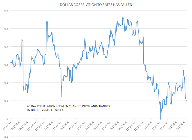 The $64,000 question, of course, is whether this is just a correction or the start of a bigger dollar move. On the face of it, you might be tempted to say the former...after all, US fixed income is rallying, and one might expect the dollar to require a more solid rate backing to develop a sustainable run. Perhaps, but the fact is that the correlation between the dollar and US rate expectations has really dropped this year. On a 60 day rolling basis, the current correlation between changes in the DXY and changes in the 1st vs 5th eurodollar contracts is just 0.1.