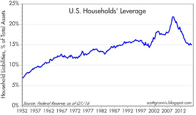 The ongoing accumulation of wealth is not a house of cards built on a bulging debt bubble either, regardless of what you might hear from the scaremongers. The typical household has cut its leverage by over 30% (from 22% to 15%) since the onset of the Great Recession in 2008. Household liabilities today are the same as they were in early 2008 (about $14.5 trillion), but financial assets have increased by one-third since then, thanks to significant gains in savings deposits, bonds, and equities. Since the peak of the housing market in 2006, the value of households' real estate holdings has not only fully recovered, but has grown by almost 4%. Moreover, the Federal Reserve calculates that owners' equity in real estate has returned to its 2006 high ($13 trillion), having more than doubled since its mid-2009 low.