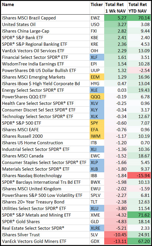 ECB taper tantrums led the worries which created ripples into the Forex and Commodities markets. Equity yield proxies (Utes, REITs, Staples) again suffered, while Bank and Financial stocks enjoyed the upward glide in rates. Gold, Silver and Mining took a shovel to the head with the big move up in the U.S. Dollar and the ECB backing away from stimulus. Emerging Markets outperformed—helped by both rising Energy prices and specific issues in both Brazil and China.
