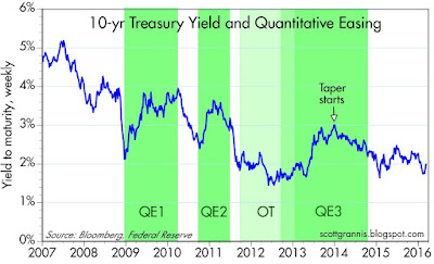 The chart above shows what happened to 10-yr Treasury yields during the Fed's three Quantitative Easing programs. In each period, despite massive bond purchases, the yield on 10-yr Treasuries rose. Ironically, the Fed justified QE by saying it would depress yields, and that in turn would stimulate the economy. What I think really happened to cause yields to rise despite Fed bond purchases was that the Fed's QE efforts supplied badly-needed bank reserves to the system, and that satisfied the market's thirst for safe assets; that in turn resulted in healthier market liquidity, which in turn caused the market to become somewhat more optimistic about future growth, which in turn caused the market to anticipate higher short-term interest rate guidance from the Fed in the future.
