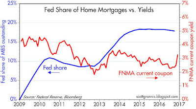 The chart above compares the magnitude of the Fed's MBS purchases with the level of MBS yields. Here we see that despite huge MBS purchases in 2009, MBS yields were relatively unchanged. More recently, with Fed holdings of MBS holding relatively steady, yields have surged. No convincing causality or correlation that I can see between these two lines.