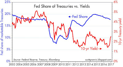 The chart above compares the magnitude of the Fed's Treasury purchases with the level of 10-yr yields. It stands to reason that the Fed could potentially manipulate the bond market only if it buys or sells a quantity of bonds that is significant relative to the outstanding supply of those bonds. Thus the rationale for the blue line, which is the ratio of the Fed's holdings of Treasuries relative to the total marketable supply of Treasuries. Several things jump out: 1) during 2008, as Fed holdings of Treasuries were plunging, yields were falling, and 2) in 2013, as Fed holdings of Treasuries was surging as part of QE3, Treasury yields surged (both in contrast to what the Fed promised QE would do), and 3) the Fed currently holds about 18% of outstanding Treasury debt, and that is about the same amount it held at the end of 2004 and less than the 20% of Treasury debt it held at the end of 2002, yet yields today are much lower than they were back then. Tough to see any convincing or enduring correlation between these lines.