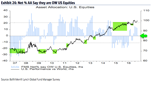 Among the various ways of measuring investor sentiment, the BAML survey of global fund managers is one of the better as the results reflect how managers are allocated in various asset classes. These managers oversee a combined $600b in assets.