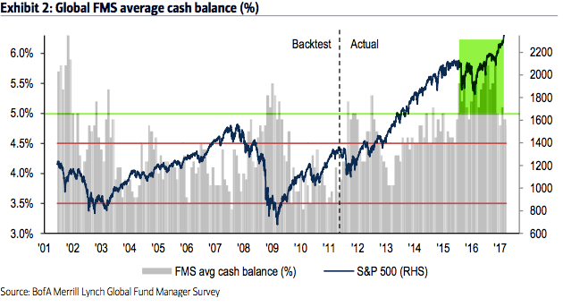- Cash: The typical range is 3.5-5.0%. BAML has a 4.5% contrarian buy level but we consider over 5% to be a better signal. More on this indicator here.