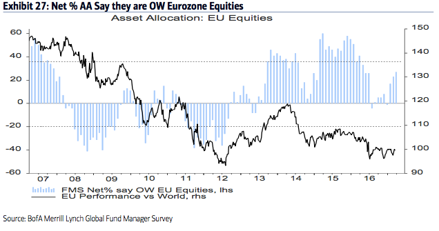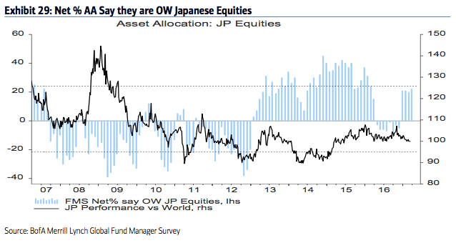 Japanese equities: Allocations to Japan had been falling in 2016 after excessive bullishness in 2015. Allocations fell to -8% underweight in September, the lowest since December 2012. Now, allocations have jumped back to +22% overweight. This is 0.6 standard deviations above its long term mean. Bullish sentiment is close to becoming a headwind (dashed line)