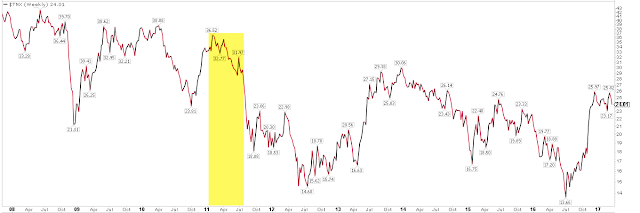 Emerging markets equities: In January 2016, allocations to emerging markets fell to their second lowest in the survey's history (-33% underweight). As the region outperformed in 2016, allocations rose to +31% overweight in October, the highest in 3-1/2 years. That made the region a contrarian short. Emerging equities then dropped 10% in the next two months, and allocations fell to -6% underweight in January, making the region a contrarian long again. This month, allocations jumped to +18% overweight (0 standard deviations below/above its long term mean, i.e., neutral). This is where the last two rallies in emerging markets has started to fade (arrows).