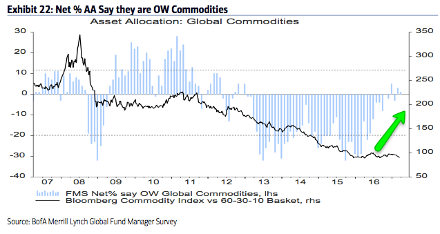 Commodities: Allocations to commodities remain near a 4-year high (+1% overweight). This is 0.3 standard deviations above its long term mean. Â In comparison, a year ago in February 2016, allocations were near one of the lowest levels in the survey's history (-29% underweight). The improvement in commodity allocations goes together with increased macro optimism.