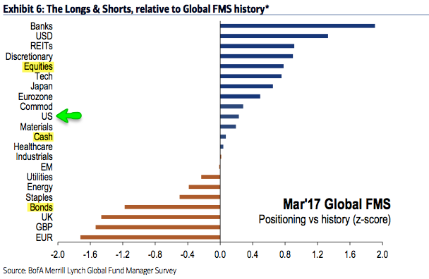 Global equities: Fund managers were just +5% overweight equities at their low in February 2016; since 2009, allocations had only been lower in mid-2011 and mid-2012, periods which were notable bottoms for equity prices during this bull market. Allocations in March have jumped to +48% overweight, a 2-year high. This is now well above neutral (0.8 standard deviation above the long term mean). Outside of 2013, over +50% overweight has historically been bearish (dashed line and shading).