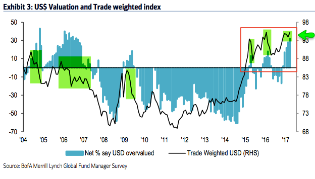Dollar: Since 2004, fund managers surveyed by BAML have been very good at determining when the dollar is overvalued. In March 2015, they viewed it as overvalued for the first time since 2009; the dollar index fell from 100 to 93 in the next two months. In late 2015, they again viewed the dollar as overvalued and the index lost 7%. Fund managers have viewed the dollar as overvalued since November 2016 (and in March by the highest amount in 11 years); since then, the dollar has traded marginally lower. Under similar conditions (highlighted in green), the dollar has fallen in value in the month(s) ahead.