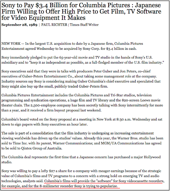 Japanese investors splashed out across the world. Ā Sony bought into Hollywood with the acquisition of Columbia Pictures in 1989. In the same year,Ā Mitsubishi bought Rockefeller Center in New York. A year later, a Japanese consortium bought all four golf courses in Pebble Beach.