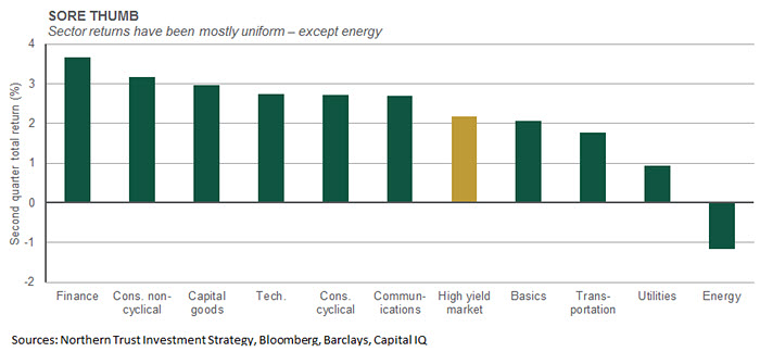 Year-to-date high yield returns have trailed other risk asset classes – gaining just over 5% as compared to 11% for U.S. equities, but this is still a solid return for this relatively low-risk asset class. So far this year, high yield spreads have moved steadily downward in a fairly tight range. Further, volatility among sectors has also been tight of late. In the second quarter, eight of ten sectors (83% of the index) were near or above the market average return of 2.2%. The only real sources of volatility have been in the energy-related sectors. The energy sector delivered a materially negative return, driven by renewed oil price weakness (though oil prices have since stabilized). Utilities underperformed to a lesser extent given less-direct exposure to the energy complex.