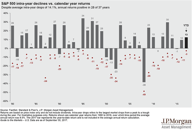 Since 1980, the S&P has fallen an average of 14% during the course of the year.