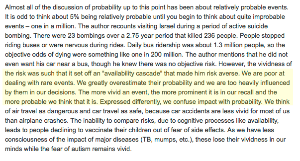 We greatly overestimate the probability of rare events and "are too heavily influenced by them in our decisions. The more vivid an event, the more prominent it is in our recall and the more probable we think that it is. Expressed differently, we confuse impact with probability."