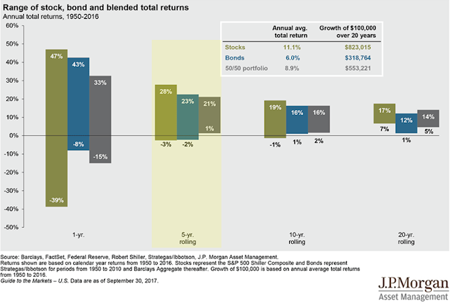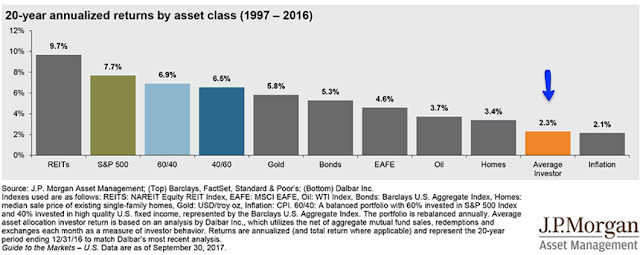 That fact is apparent in the statistics, where the average investor earns a return that is less than 1/3 of what they would have earned if they knew nothing and blindly invested in the stock market (next 3 charts from JPM).