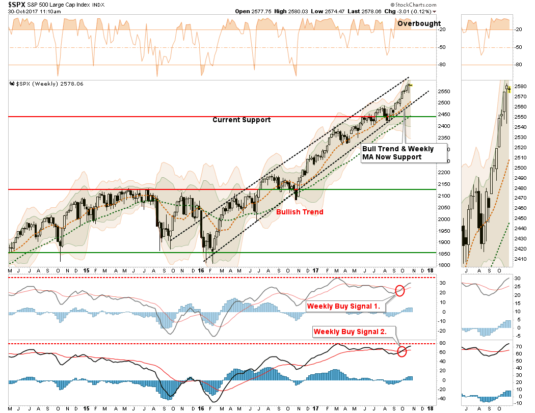 With the market currently on WEEKLY buy signals, both short and intermediate term, the trend and momentum are clearly in favor of the bulls. However, (and you knew this was coming) with the market pushing large deviations from both the trend and running support levels, a correction of 3-5% is not out of the offing. This suggests that increasing equity risk at these levels is outweighed by the risk of a corrective action.