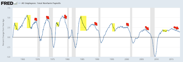For this reason, it's better to look at the trend; in December, trend employment growth was 1.4% yoy. Until spring 2016, annual growth had been over 2%, the highest since the 1990s. Ahead of a recession, employment growth normally falls (arrows). Continued deceleration in employment growth in the coming months continues to be an important watch out.